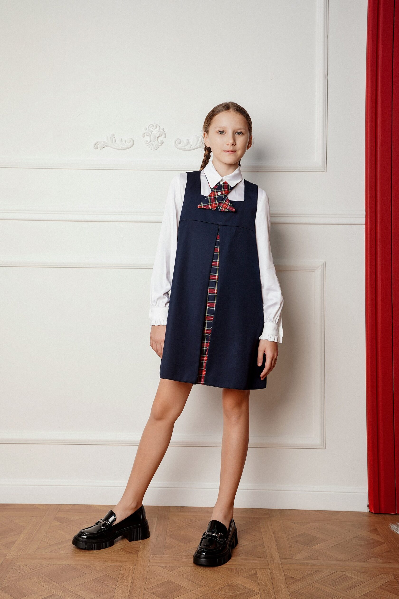 Белая рубашка темно- синие классические брюки темно- синий свитшот с эмблемой школы и красным воротом галстук в клетку темно- синяя или черная классическая обувь
